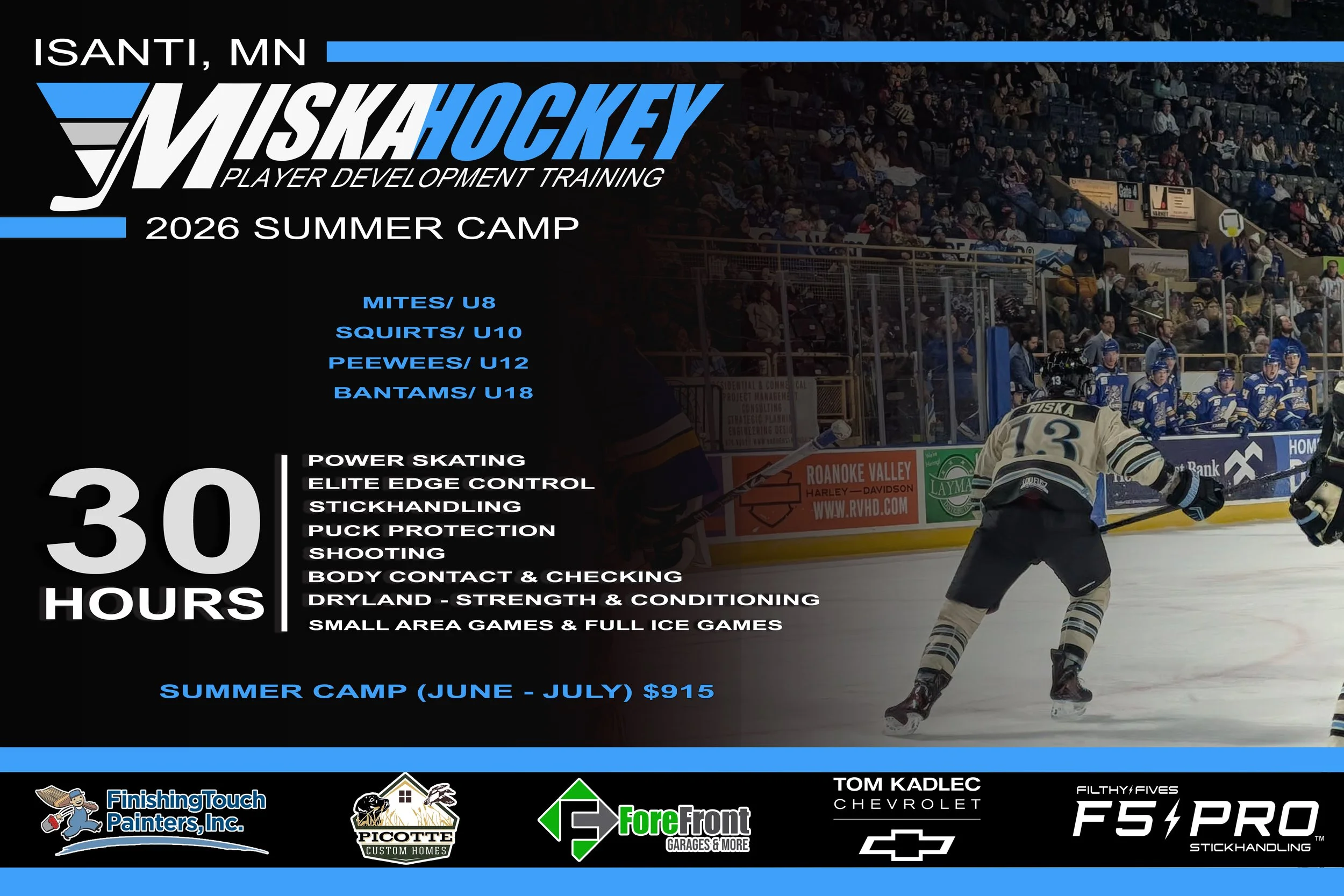 These summer camps are focusing on the Mites, Squirts, Peewees, Bantams, High School/ U18, Juniors, and College players.
